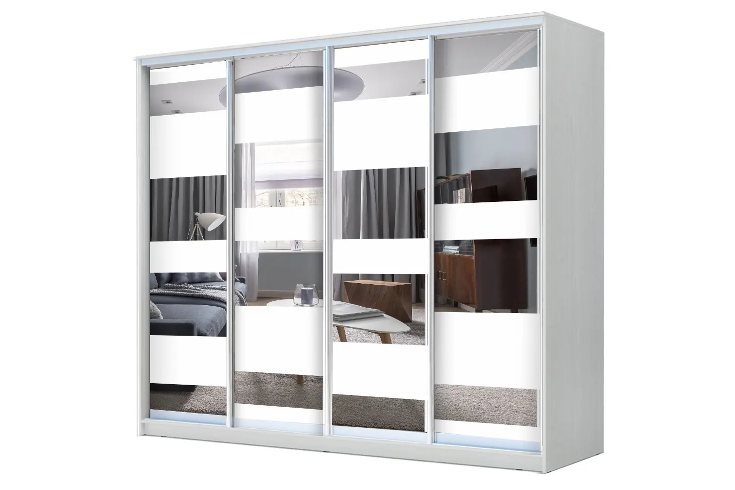 Интернет-магазин «Купи-купе» предлагает готовые корпусные шкафы-купе по ценам производителя. Купить Шкаф-купе 4-х дверный ХИТ с пескоструйным рисунком Полосы на 4 фасада без торговой наценки
