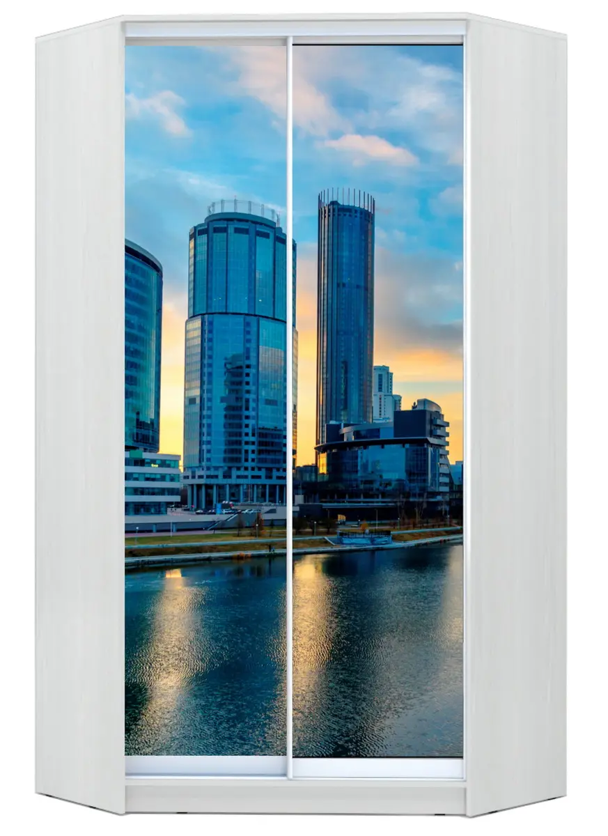 Интернет-магазин «Купи-купе» предлагает готовые корпусные шкафы-купе по ценам производителя. Купить Шкаф-купе 2-х дверный угловой ХИТ с фотопечатью Городской пейзаж без торговой наценки